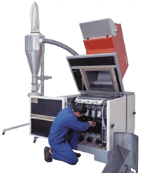 - System components such as material in-feed conveyor, metal detector, metal separator, granulate removal and de-dusting units for the complete recycling package.