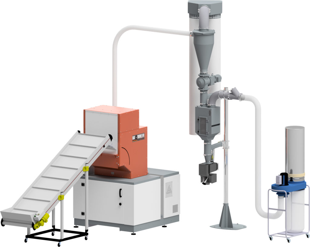 Neben der zu Ihren Anforderungen passenden Schneidmühle liefern wir auch die gesamte Peripherie, angefangen vom Fördergebläse mit der passenden Verrohrung, dem Zyklonabscheider mit Gestell, und falls gewünscht auch Zellenradschleuse, Metallseparator und Förderband mit oder ohne Metallsuchspule. Für sehr lärmsensitive Bereiche besteht zudem die Möglichkeit, die gesamte Schneidmühle zusätzlich zu kapseln, so dass solche Zerkleinerungsanlagen auch zentral und produktionsnah in einer Halle aufgebaut werden können. Gebläse und Zyklone sind dabei hinsichtlich der für die Förderung notwendigen Luftmengen soweit aufeinander abgestimmt, dass Granulat und Luft sauber getrennt werden. Die beiden groß dimensionierten Filtersäcke sorgen dafür, dass die Umgebung weitgehend unbelastet bleibt. Falls Sie hier besondere Anforderungen haben, sprechen Sie uns einfach an.